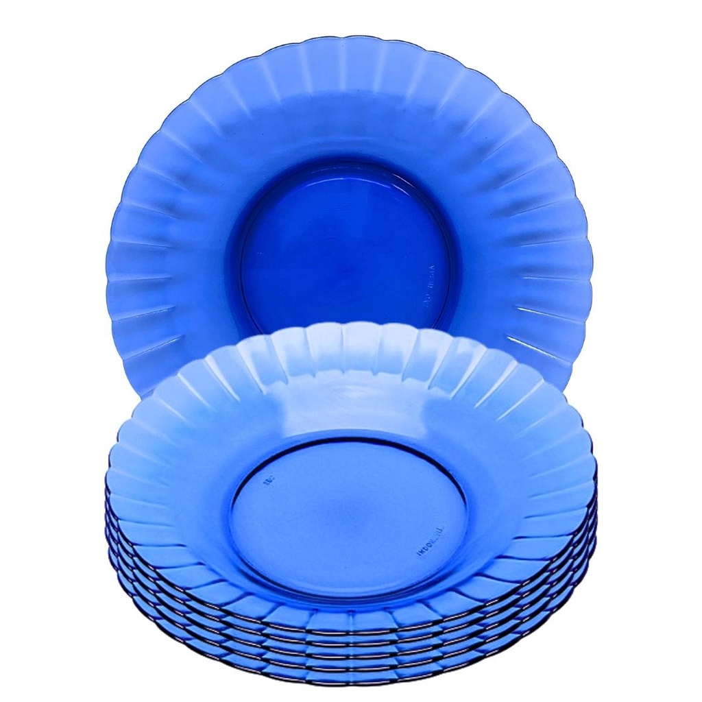 Jogo com 6 pratos fundos de vidro transparente azul listrado