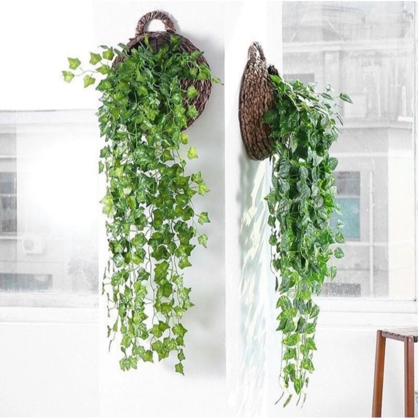 Kit 1 Arranjo Planta Decorativa + Vaso Trançado Marrom 3 Pendentes Artificial Folhas De Hera