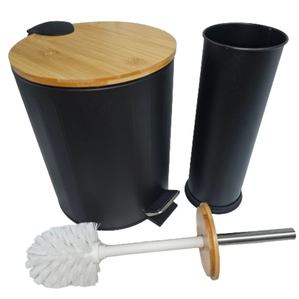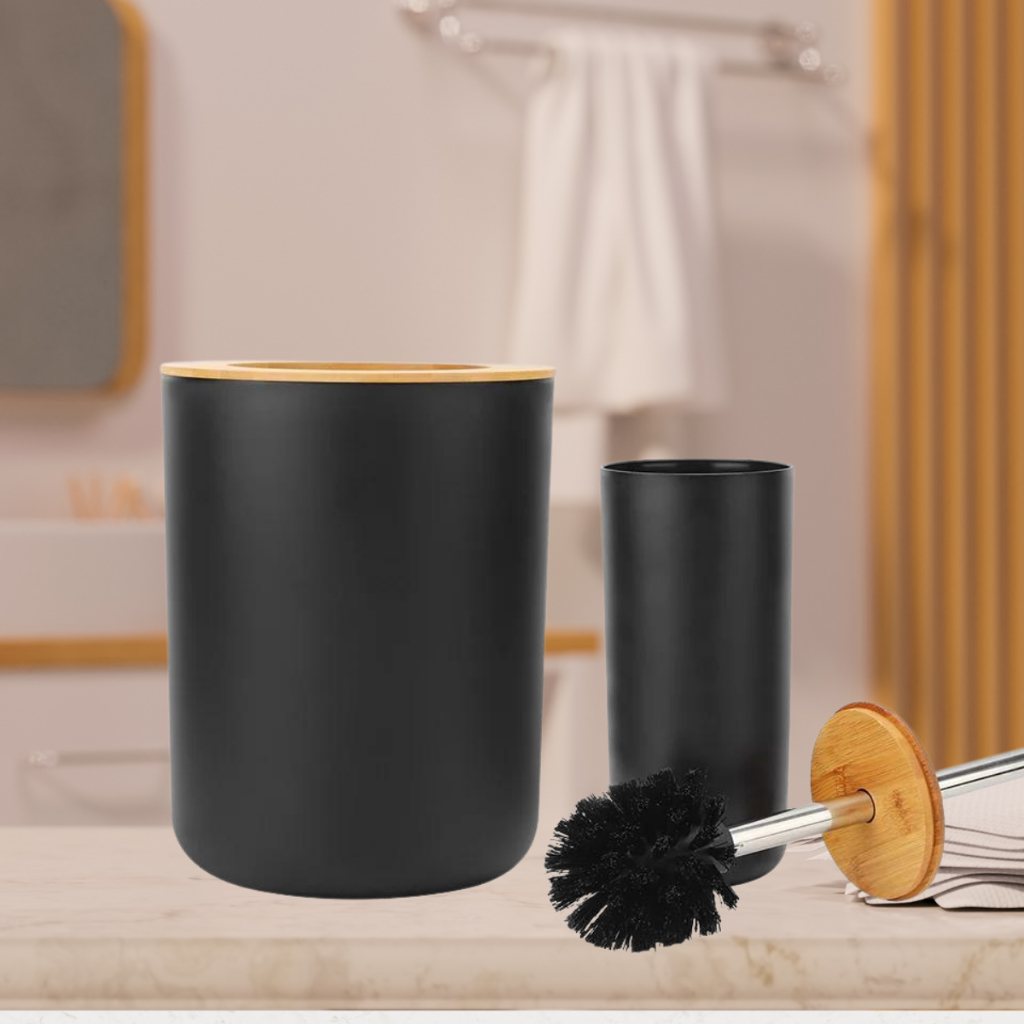 Kit Banheiro Com Lixeira Frisada 5 Litros + Escova Sanitária Preta Com Tampa em Bambu