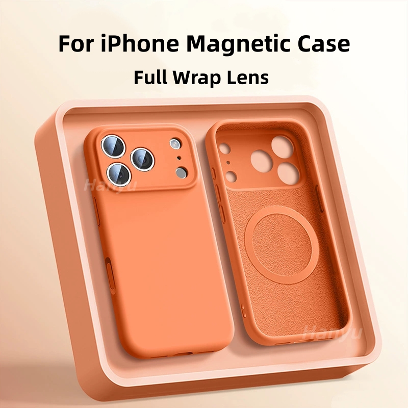 Capa De Telefone Com Proteção De Lente De Silicone Líquido Magnético Laranja Para iPhone 17 16 15 14 13 Pro Max Macia 17