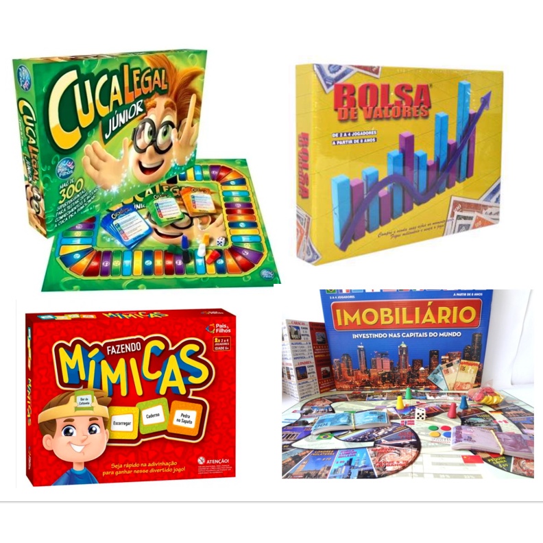 Kit com 4 Jogos de Tabuleiro - Banco Imobiliario - Cuca Legal - Mimica - Bolsa de Valores