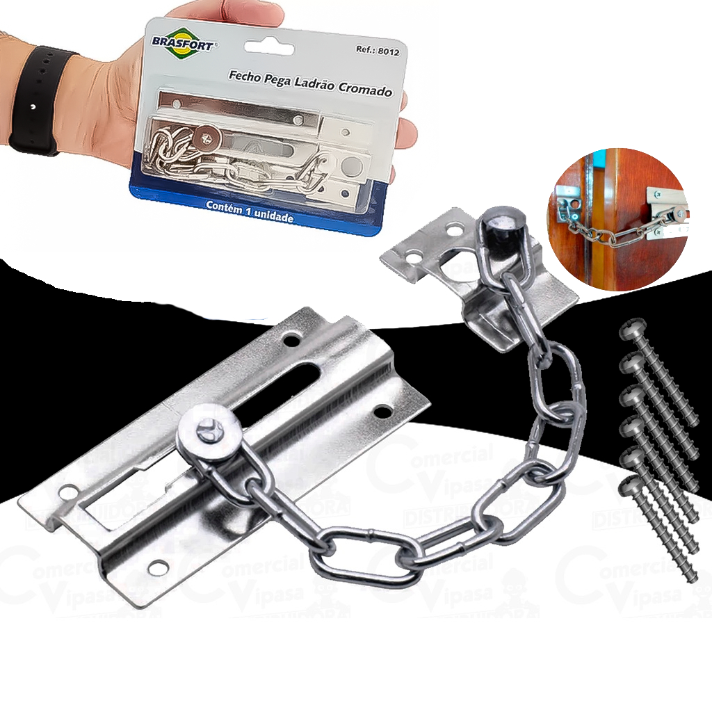 Fecho de Porta Pega Ladrão Cromado com Corrente Em Aço Carbono Para Mais Segurança