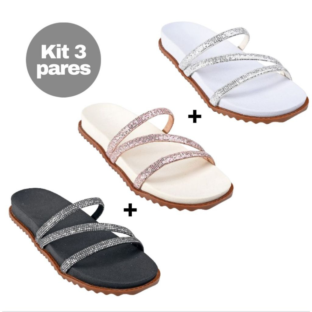 Papete Kit 3 Pares Papete Birken Sandália Strass Brilho Confortável Promoção Imperdível