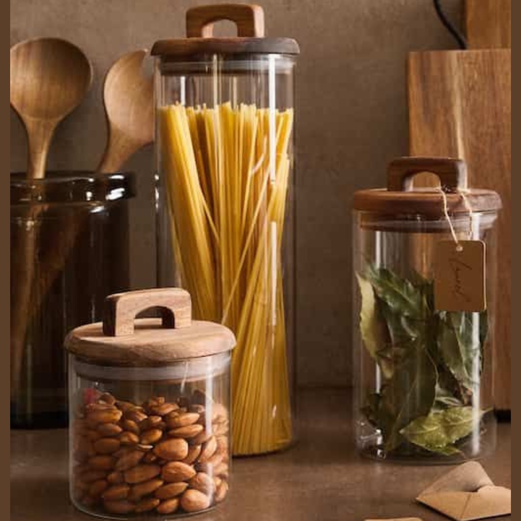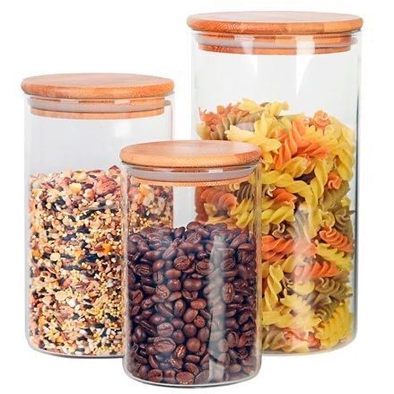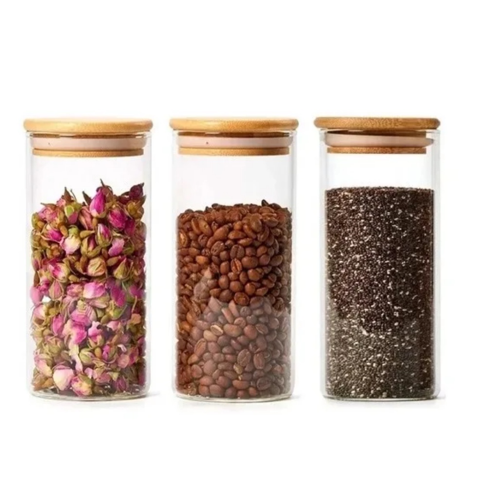 Kit com 3 Potes de Vidro Com Tampa De Bambu 500, 750 e 1.100 ml Porta Mantimento Hermético