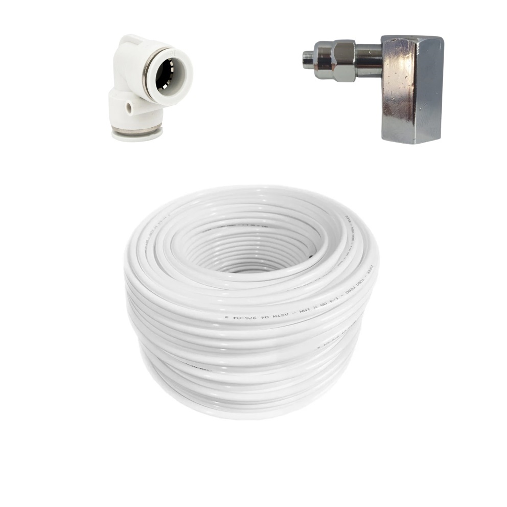 Kit Adaptador Cromado Bico 90° Rosca Fêmea 1/4 Saída 1/4 + Conexão Engate Rápido L 1/4 + Mangueira Atóxica 1/4 Ideal na Instalação de Filtros Bebedouro e Purificadores