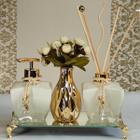 Kit Para Lavabo Luxo Aromatizador Saboneteira Bandeja Vaso Decorativo + Luxuosas Varetas Decoradas -K291 Coleção Belga