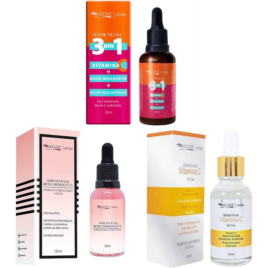 Kit c/ 3 Sérum Max Love Vitamina C + Sérum 3 em 1 + Sérum Rosa Mosqueta