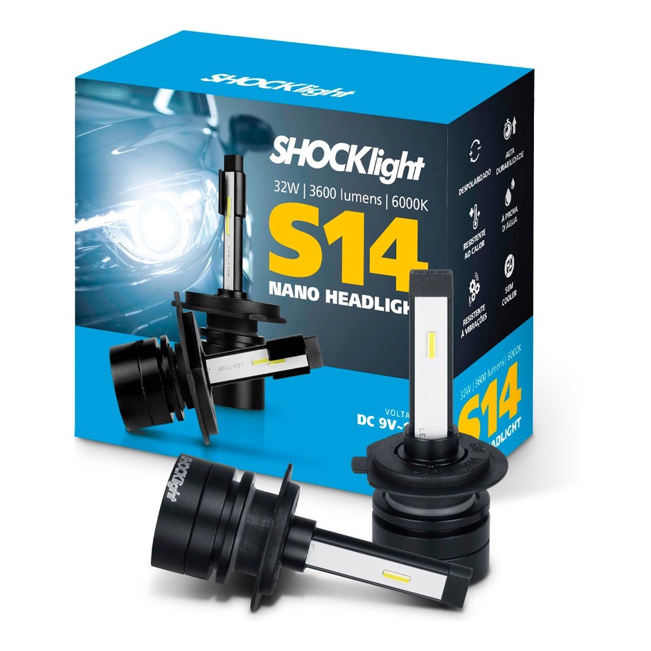 Lâmpada Super Led Shocklight S14 Nano Headlight H1 H3 H4 H7 H8 H9 H11 H16 H27 HB3 HB4 6000K 12V 32W 3600Lm