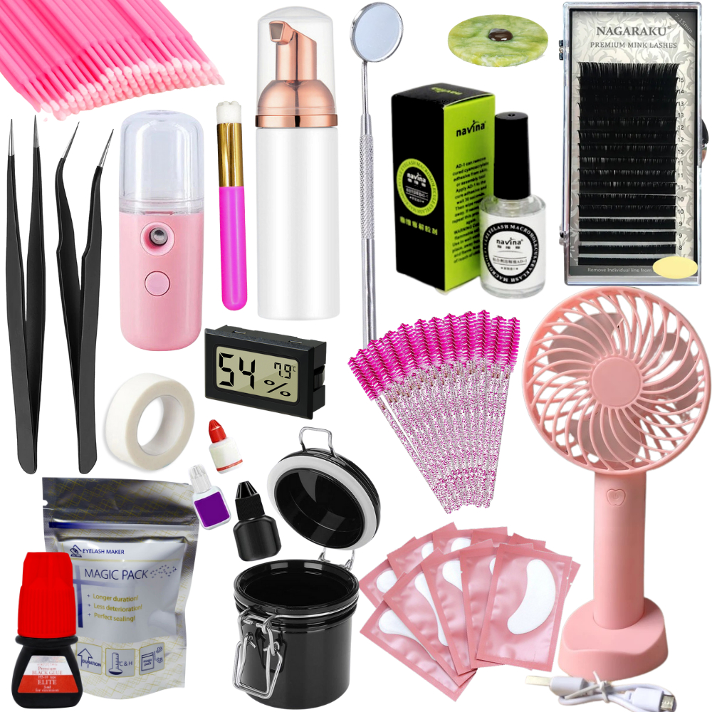 Kit Completo Treino Extensão Cílios Nagaraku Fio a Fio Y Volume Brasileiro Cola Elite HS10 3ML Removedor e Espuma Navina Ventilador Cabeça Boneca Treino Ventilador e Nano Mister USB Escovinha e Microbrush