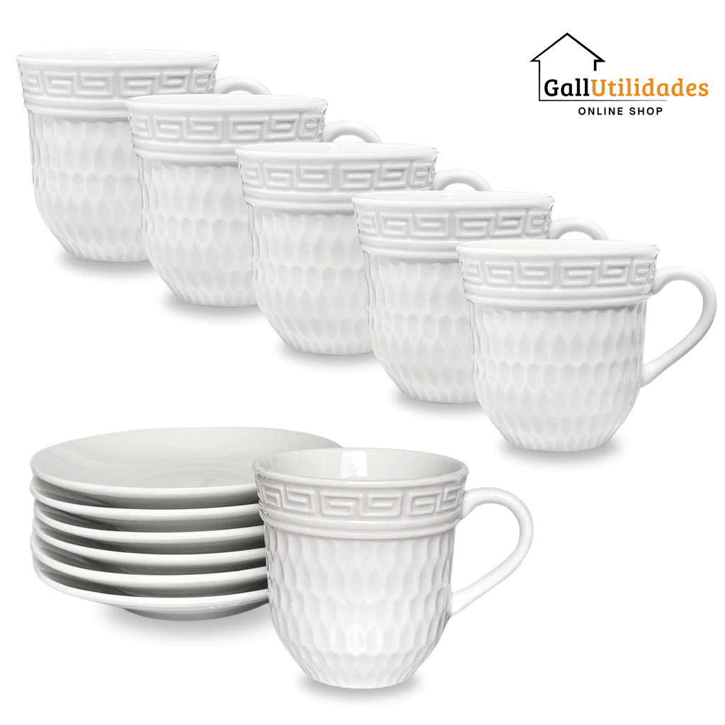 Jogo Xicara de Cafe Porcelana Expresso Branca Desenho 12 Peças 65 ml Com Pires Alça