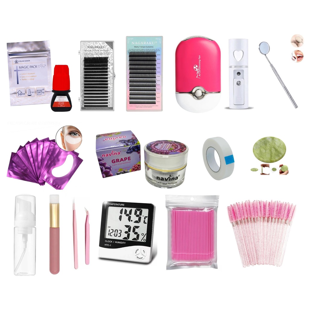 Kit Completo Treino Alongamento e Extensão Cílios Nagaraku Volume Brasileiro Y e Russo Cola Elite HS10 Higrometro Removedor Navina