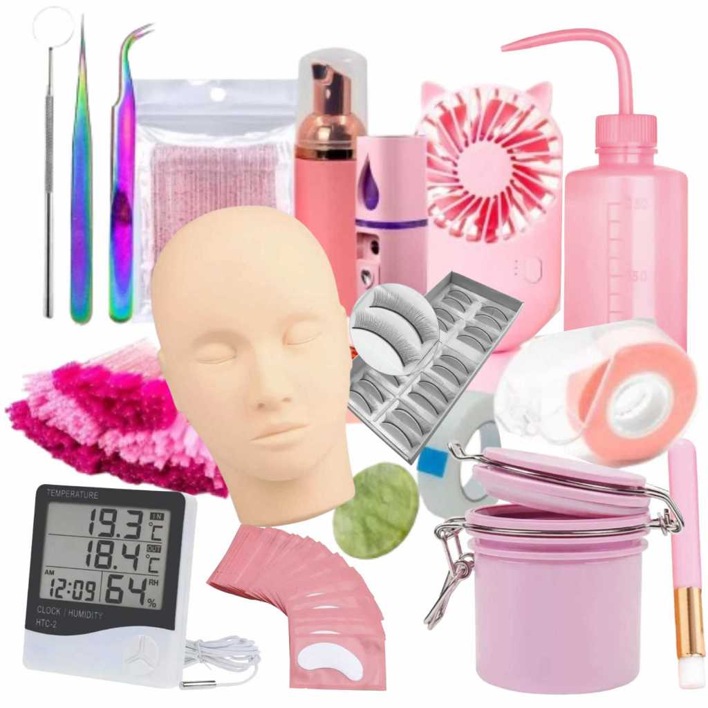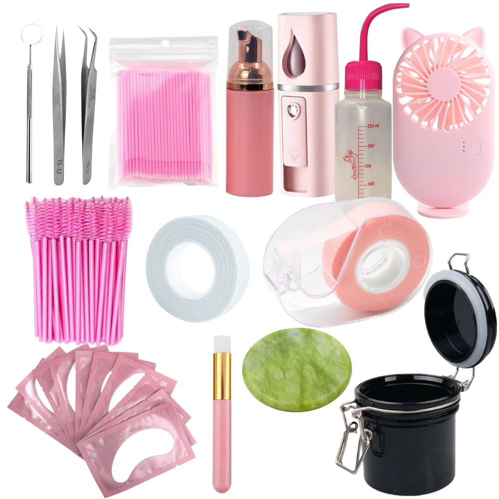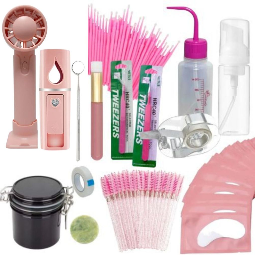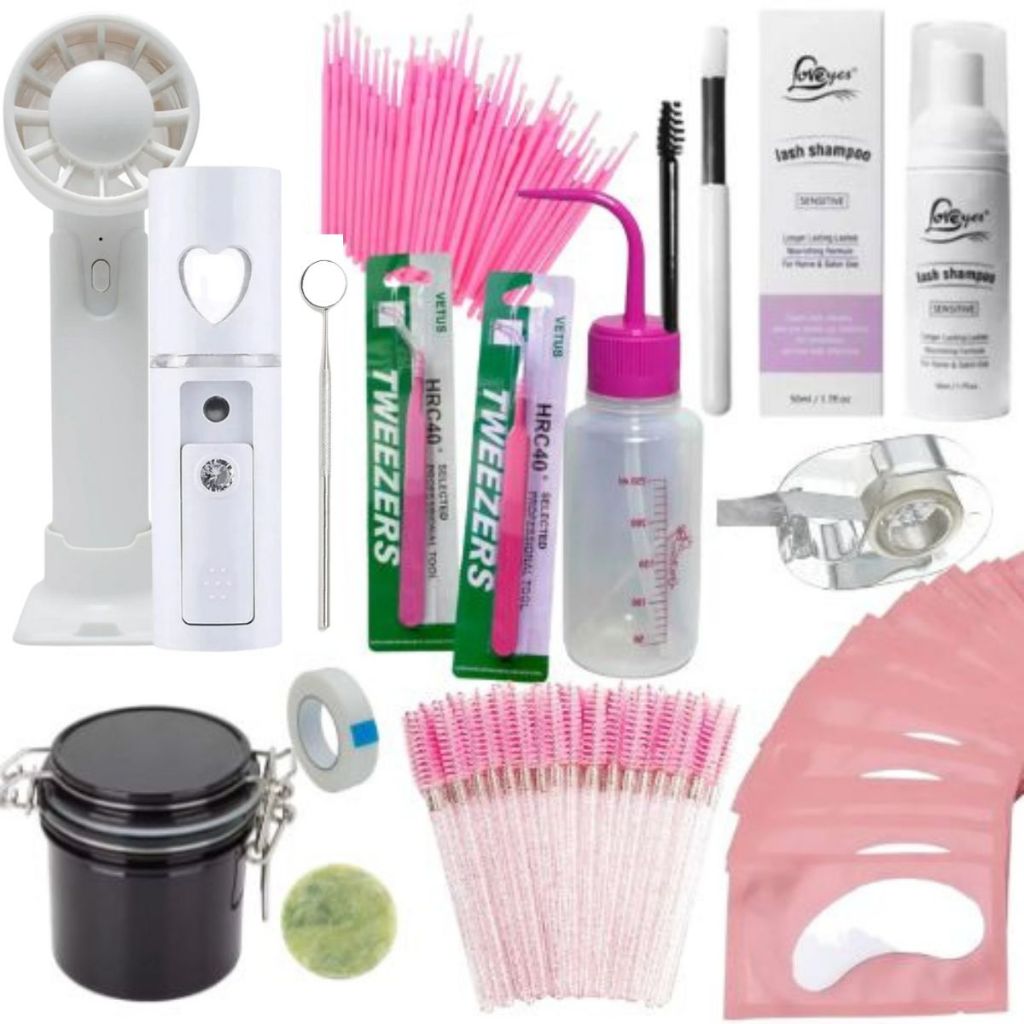 Kit Completo Iniciante Treino Extensão e Alongamento Cílios Shampoo Loveyes Ventilador Nano Spray Pinça Vetus Pisseta Pump Porta Micropore
