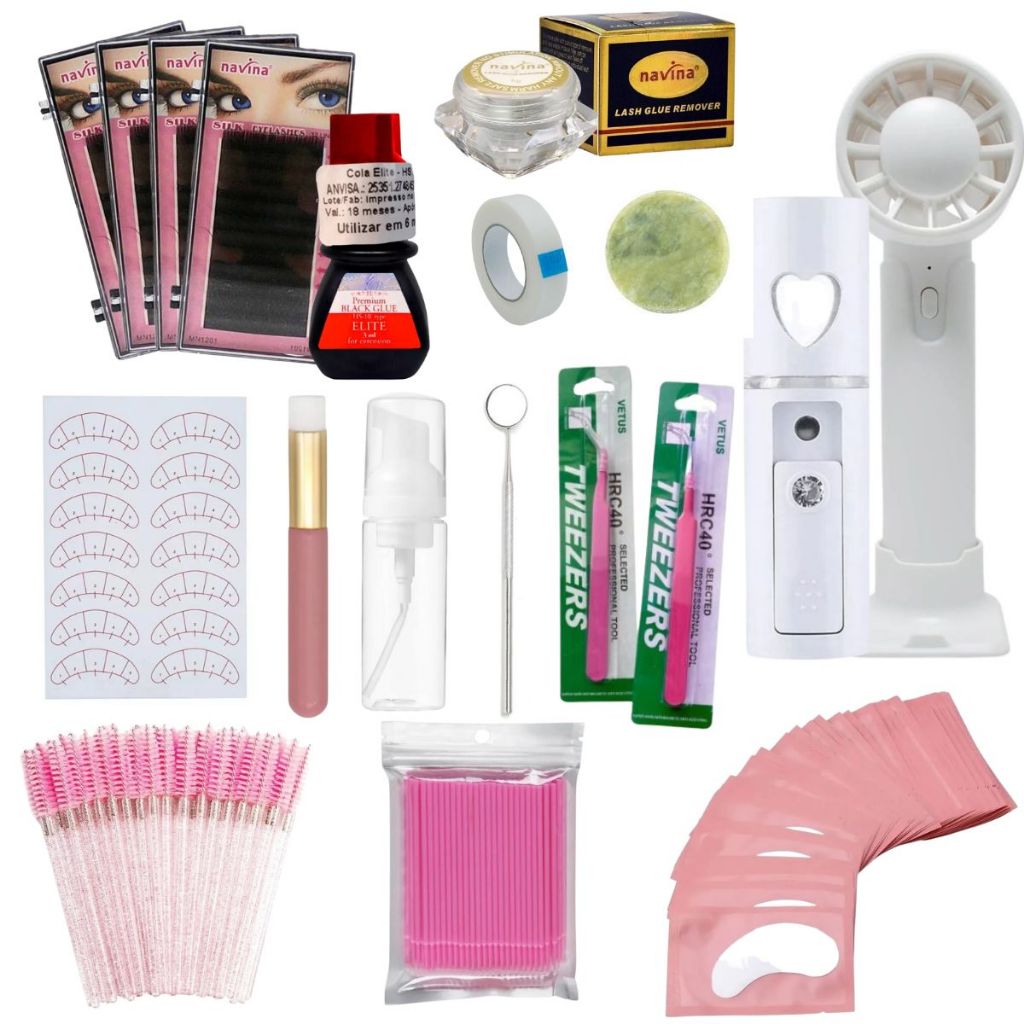 Kit Completo Iniciante Treino Extensão e Alongamento Cílios Ventilador Nano Spray Pinça Vetus Pisseta Pump