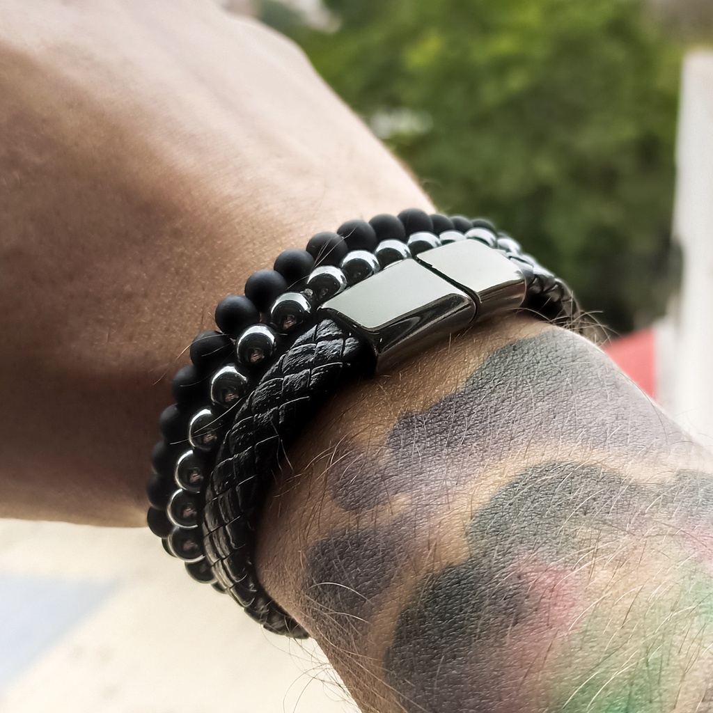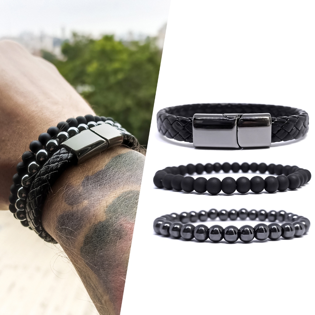 Kit 3 Pulseiras Masculinas de Couro Fecho Magnético Bolinhas Hematita