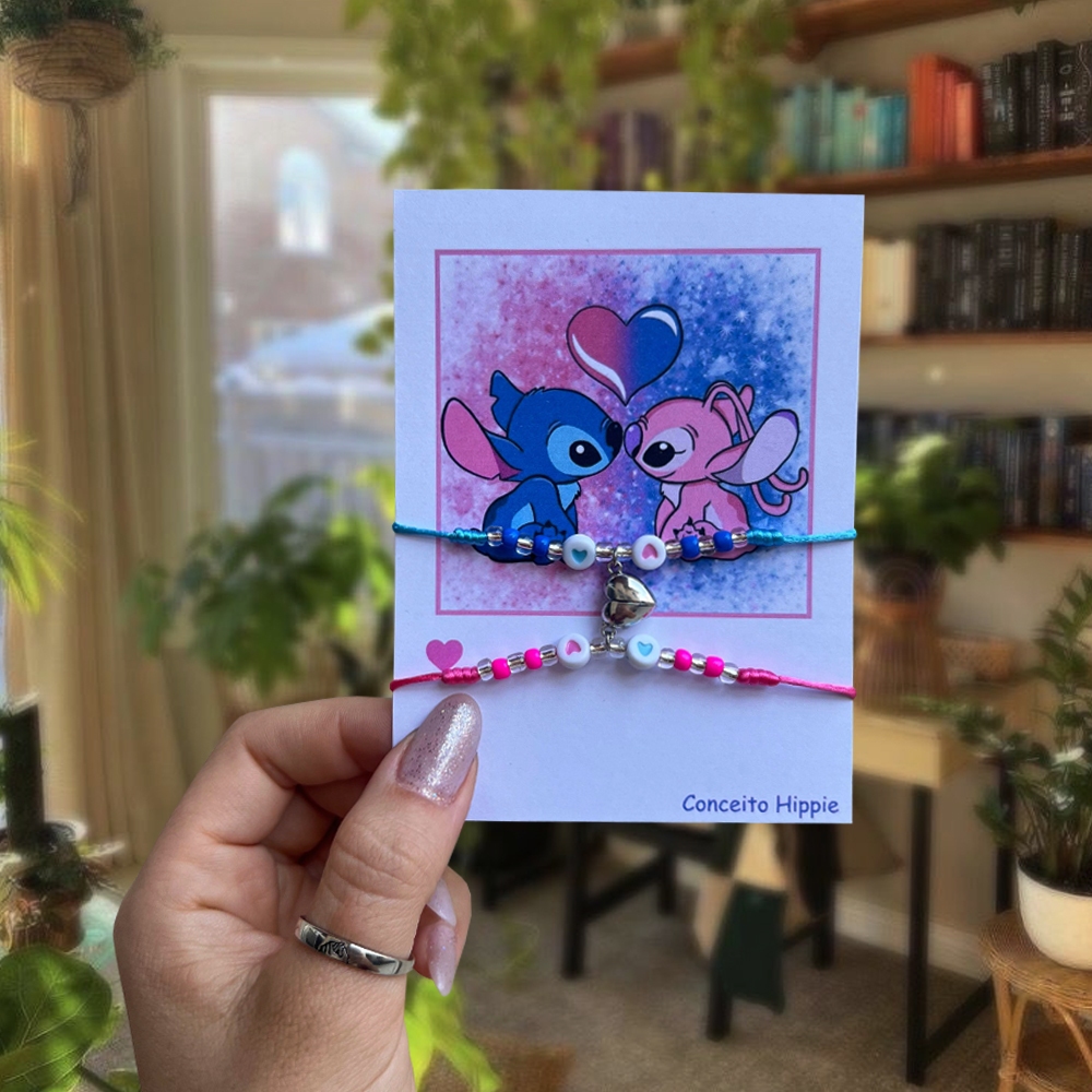 Kit Pulseiras Imã Magnético Stitch e Angel BFF Metadinha Presente Amigos Namoro Par Coração Duplo Rosa Azul