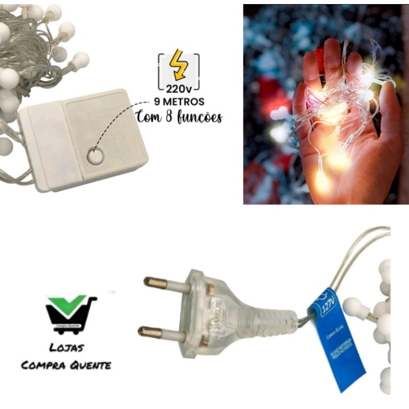 Pisca Pisca Varal 9 metros LED 100 Luzes Fio com 8 Funções 127v Decoração de Natal Jardim Externo Natalino Branco Quente Colorido Branco frio