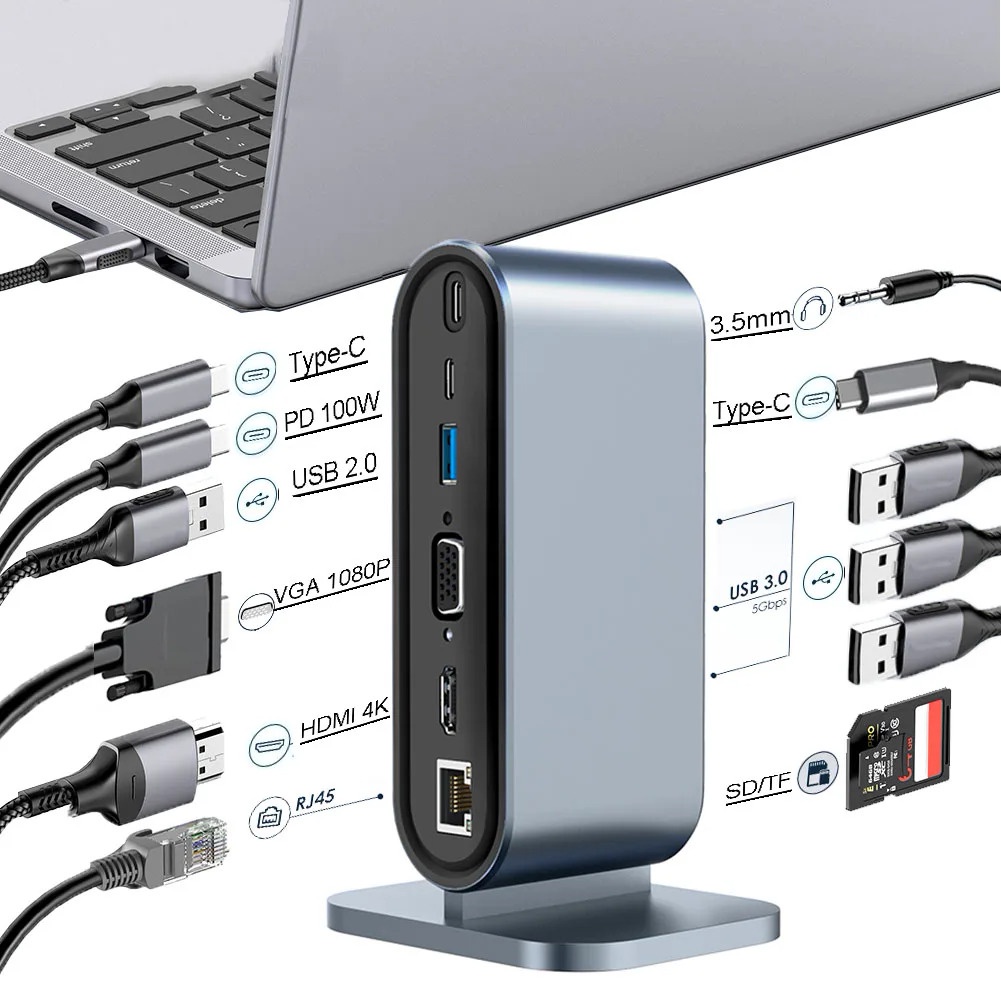 12-em-1 USB C HUB Docking Station Adaptador compatível com HDMI 4K 30Hz PD 100W Tipo-C HUB USB 3.0 Splitter para Laptop MacBook Pro Air