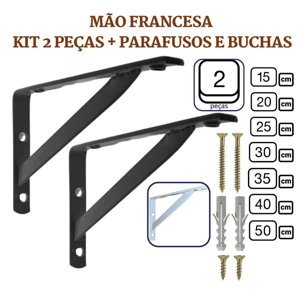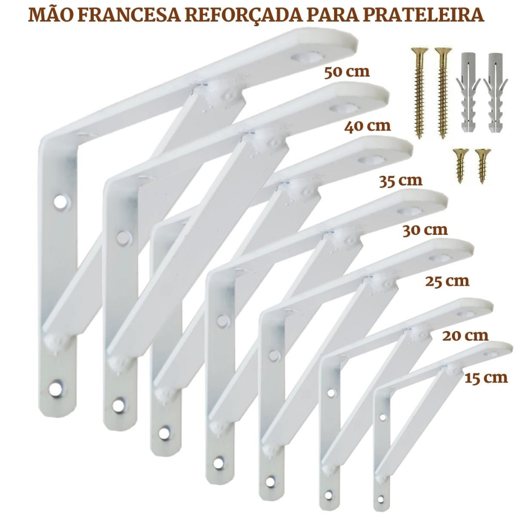Mão Francesa Suporte para Prateleira Cantoneira BRANCA de 15cm a 50cm com Parafusos e Buchas