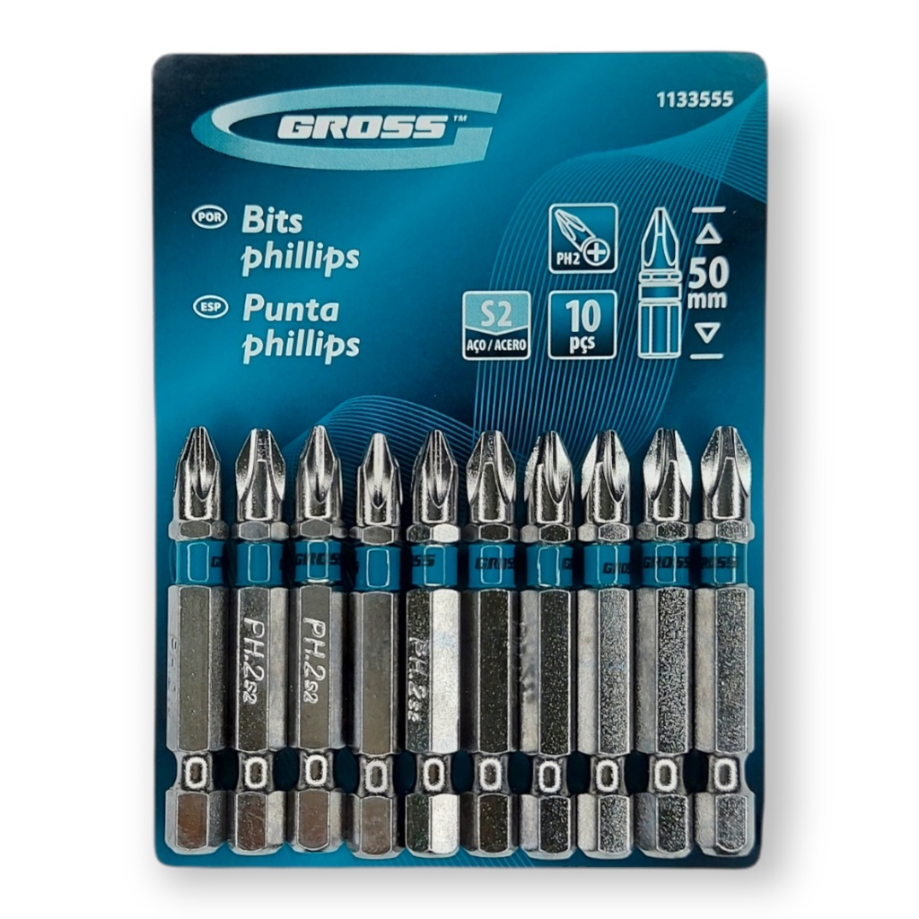 Ponta Bits PH2 50mm Ponteira Magnética Kit 10 Peças Phillips 1/4 Aço S2 Antiderrapante Imantado Gross