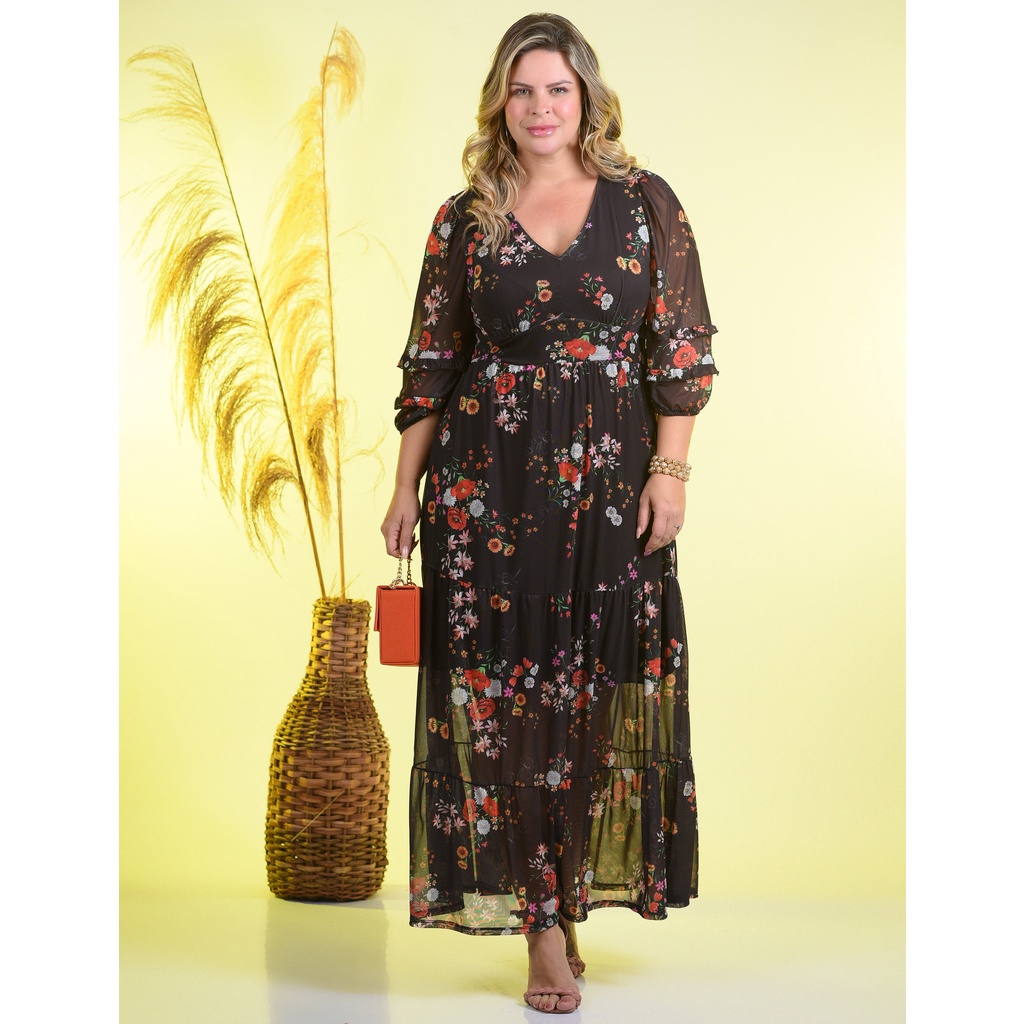Vestido Longo Tule Estampado Floral Forrado Plus Size