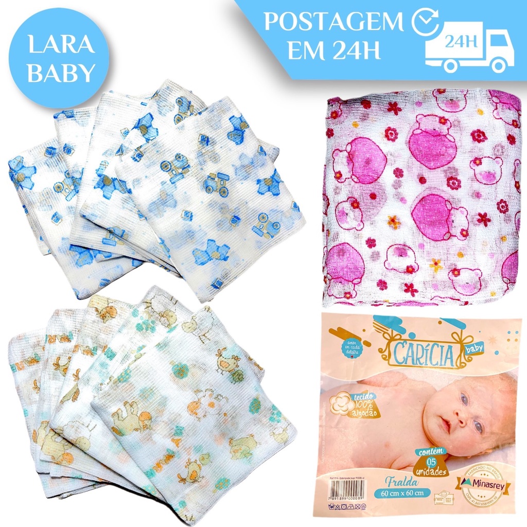 Kit 5 Unidades Fraldas de Pano Para Bebe Fina Simples 60cmx60cm Fralda 100% Algodão Minasrey Bebê