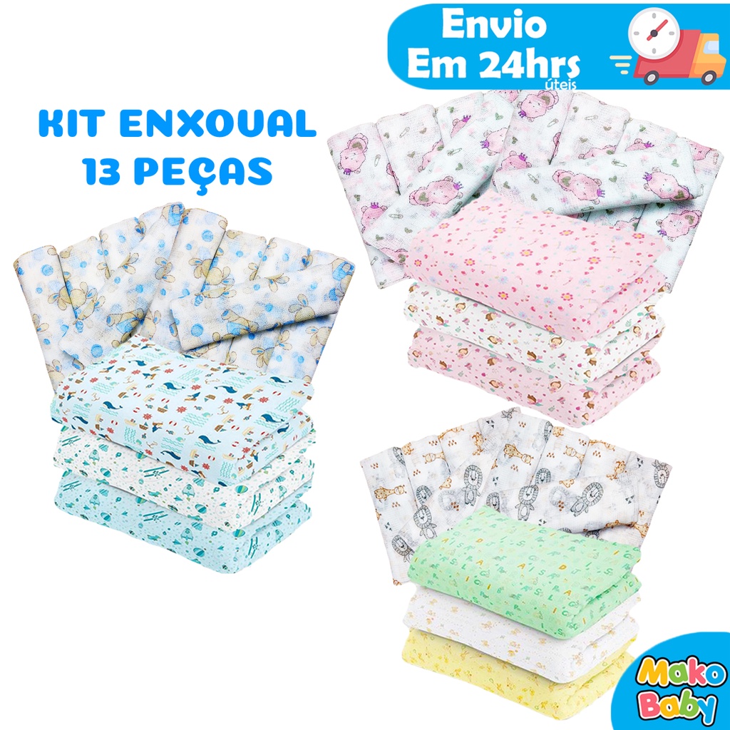 Kit Enxoval Bebe de 13 Peças - 3 Cueiro Bebe Flanelado + 10 Fralda de pano 60cm x 60cm Estampadas 100% algodão