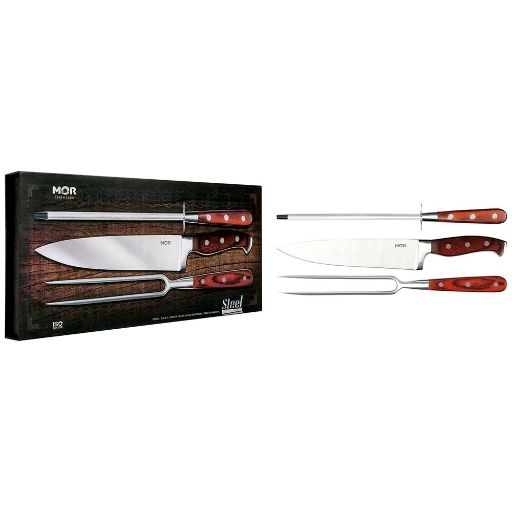 Conjunto de Faca 8", Garfo e Chaira em Aço Inoxidável e Cabo em Madeira Steel MOR