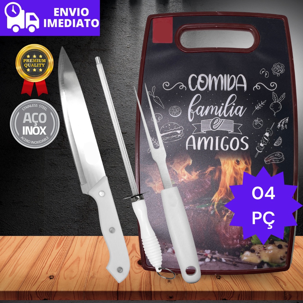 Conjunto Kit Churrasco 4 peças Tabua Faca Garfo Chaira Inox Cozinha Plastico