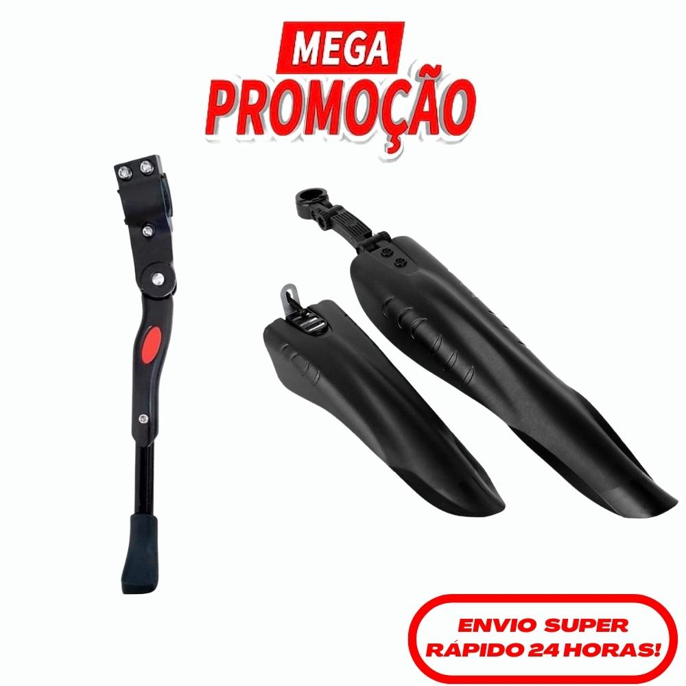 Kit Paralama Bike 3 peças regulavel preto + Descanso Lateral Pezinho preto Regulável para bicicleta