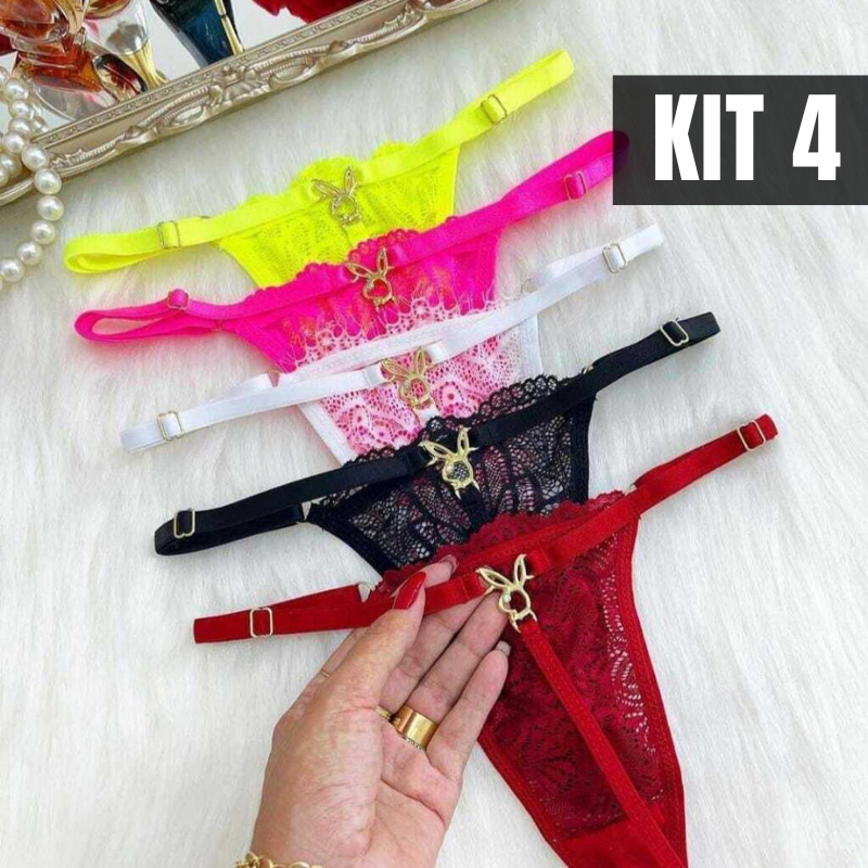 Kit 4 Calcinhas Playboy Sexy Fio Dental Sensual Em Renda Pingente Coelhinha Tanga