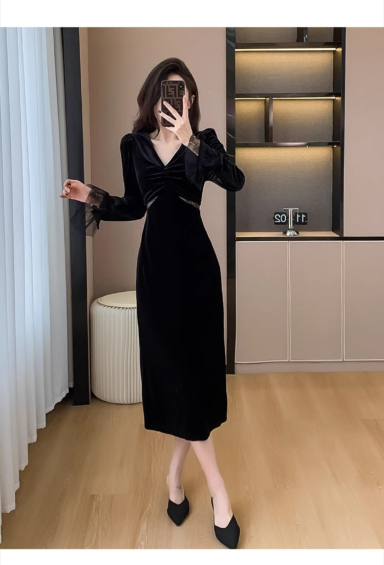 Vestido de noite de alta qualidade Vestido Preto de Temperamento Francês Celebrity v-Neck Slim-Fit Velvet Banquet Vestido de noite