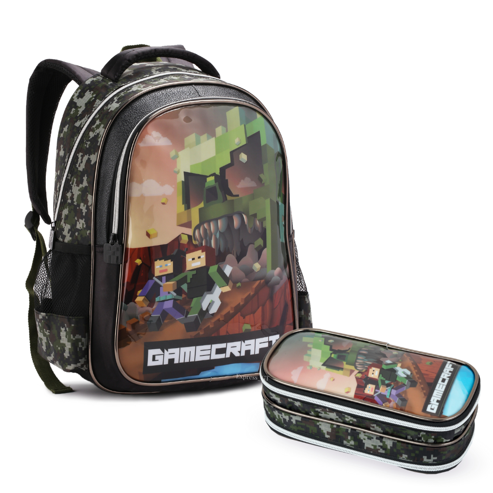 Mochila e Estojo Duplo Infantil Menino Escolar Gamecraft Grande Reforçado