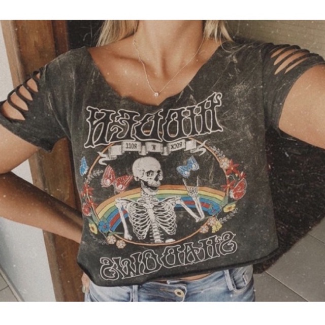 CROPPED HIDDEN SHADOWS com cortes nas mangas caveira Rock Banda Estonado 100%Algodão Ocasional