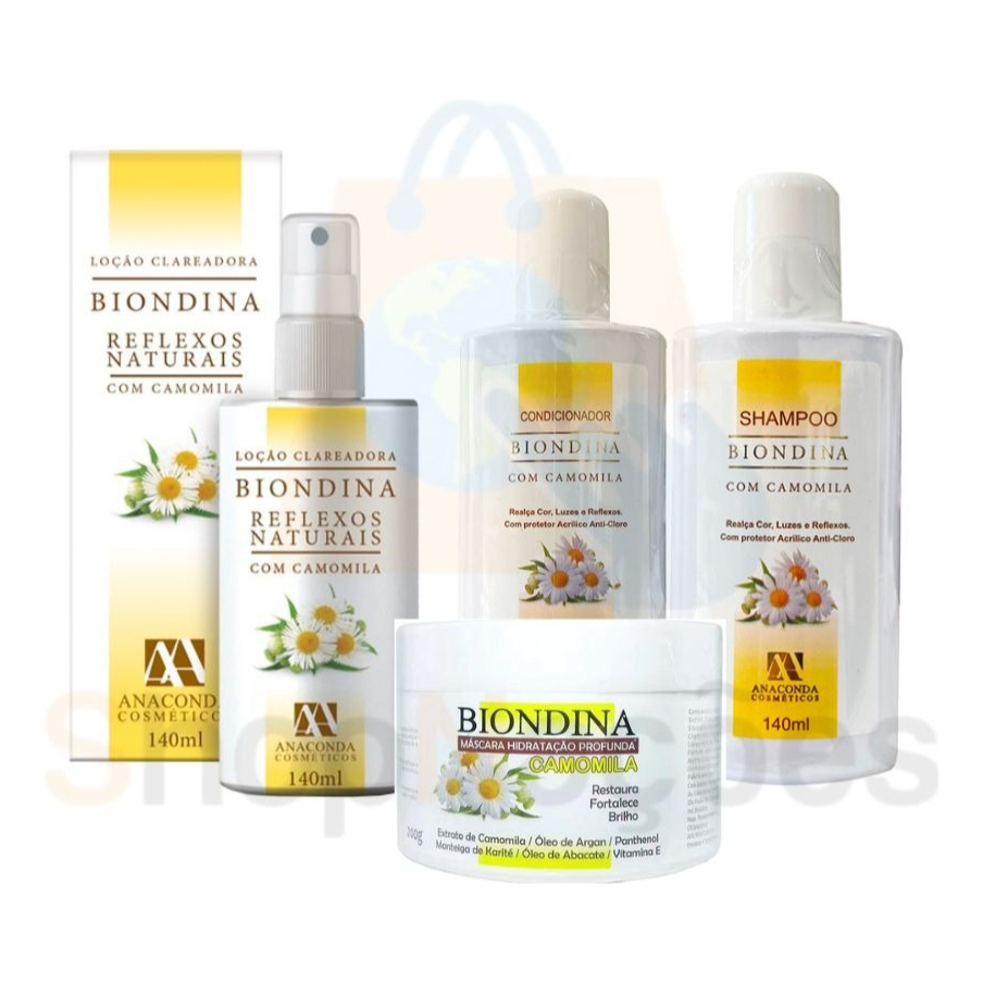 Kit Tratamento Capilar Camomila Biondina Clareadora Loção spray + Shampoo + Condicionador + Máscara