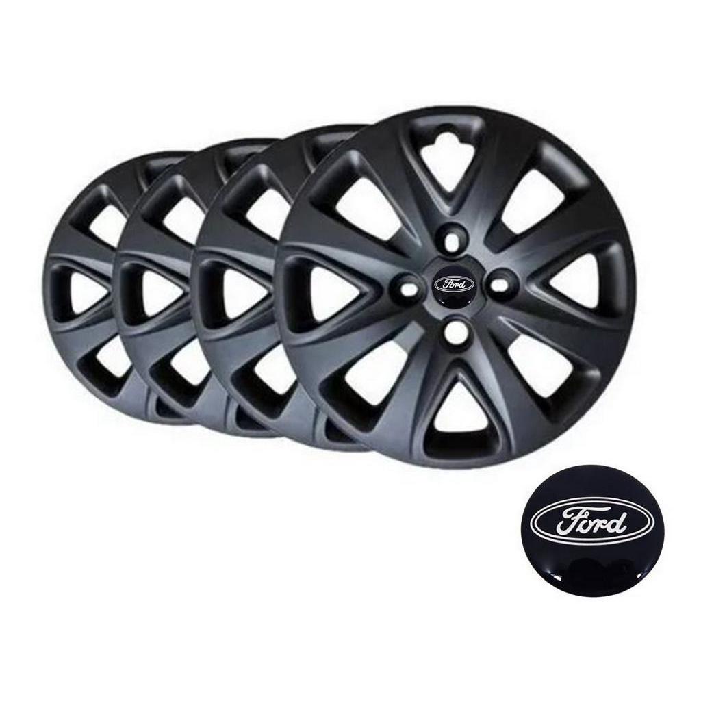 Jogo 04 Calota Roda Ford Ka+ Ka 2015 2016 2017 2018 Aro 14 Preto Fosco Com Emblema Azul