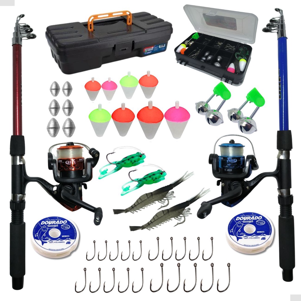 Conjunto de Pesca Completo e Barato - 2 Varas Fibra de Vidro + 2 Molinetes Com Linha , Estojo , Maleta e Iscas