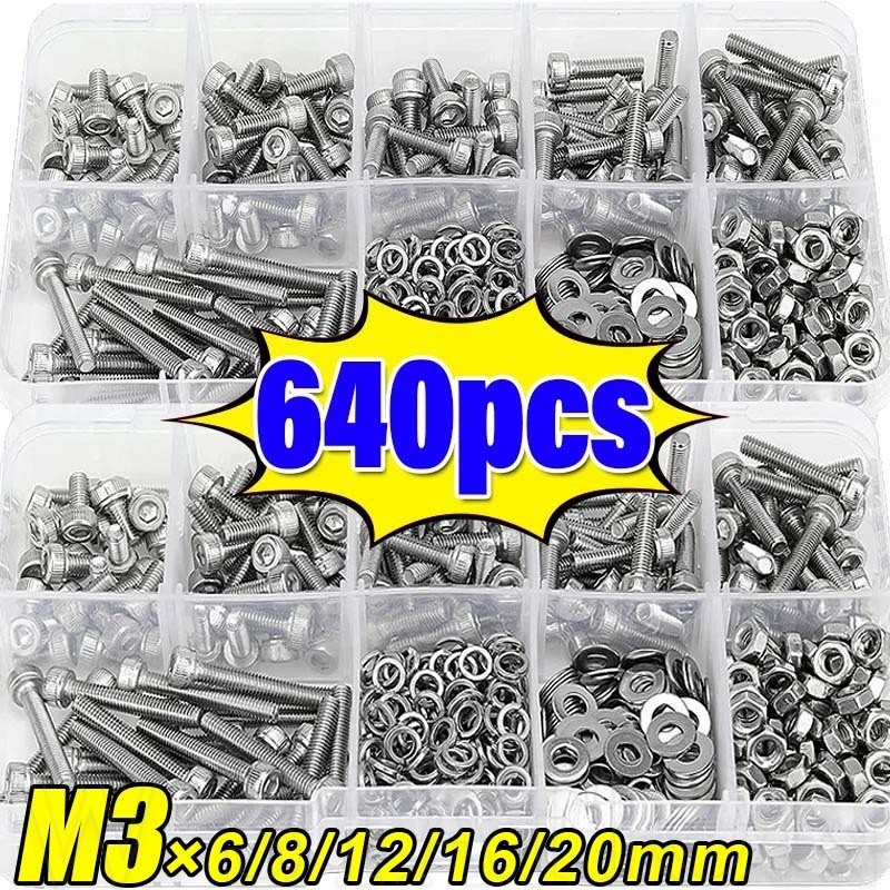 640/320Pcs M3 * 6/8/12/16/20mm Parafusos E Porcas-Kit De Arruelas De Métricos Em Aço Inoxidável-De Cabeça Sextavada Métrica-Sortimento Com Junta Plana-Ferramentas De Reparo Doméstico