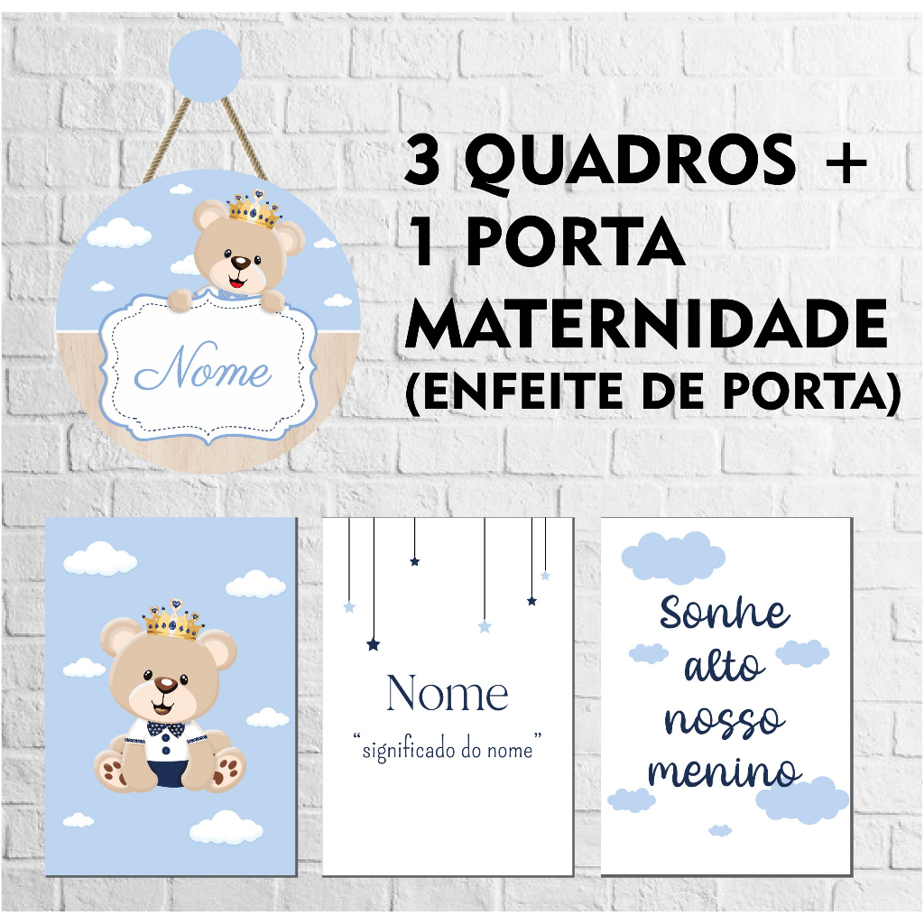 Kit Enfeite Porta Maternidade Ursinho Príncipe Azul Claro + 3 Quadros Infantil Com Nome Personalizado Decoração De Quarto Urso Menino