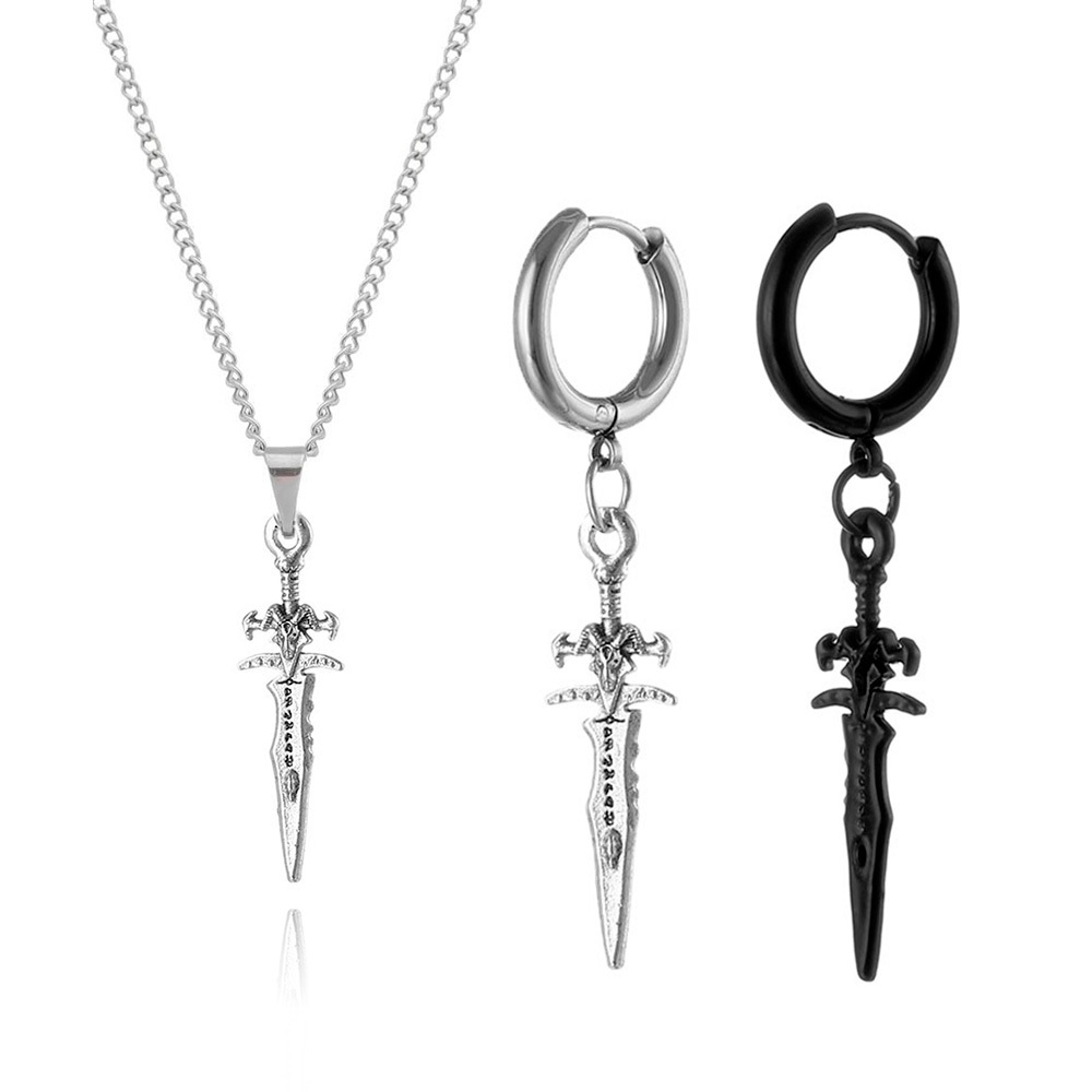 Par de Brinco de espada preto prata argola pequeno Colar corrente espada masculino feminino rock roqueiro estilo de fecho clik