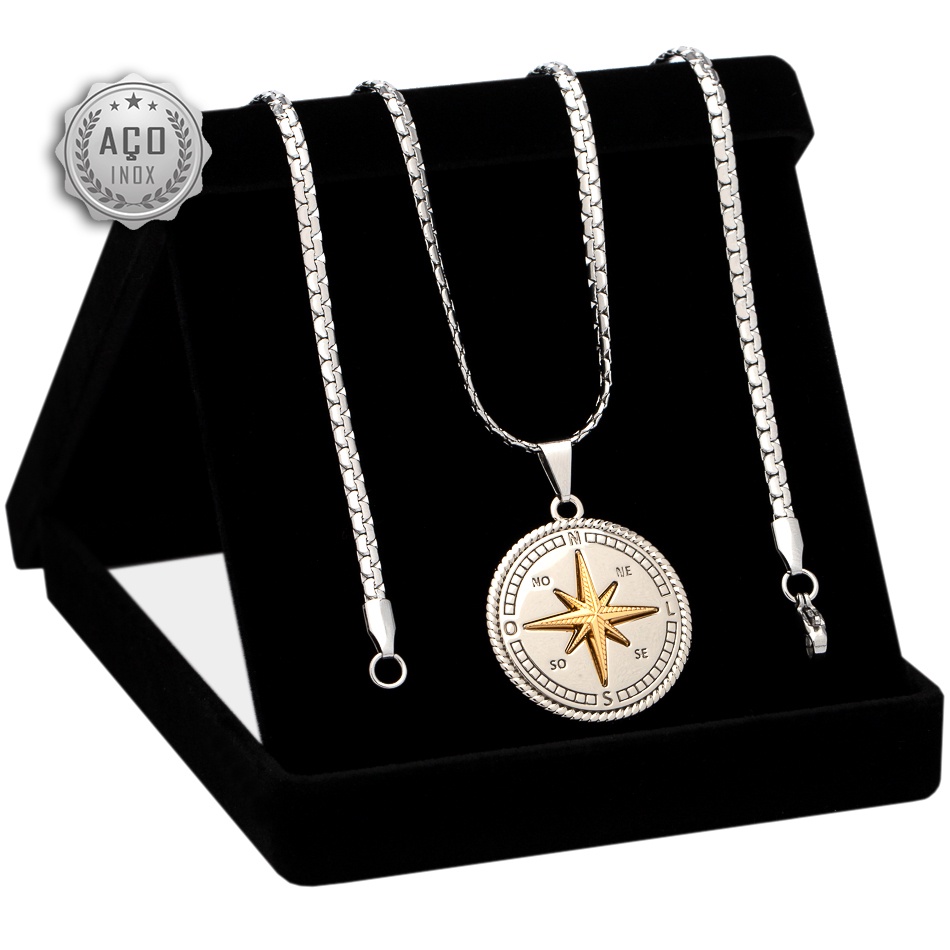 Corrente Cordao Masculino Aco Inox J-1176 Pingente Bussola OGrife