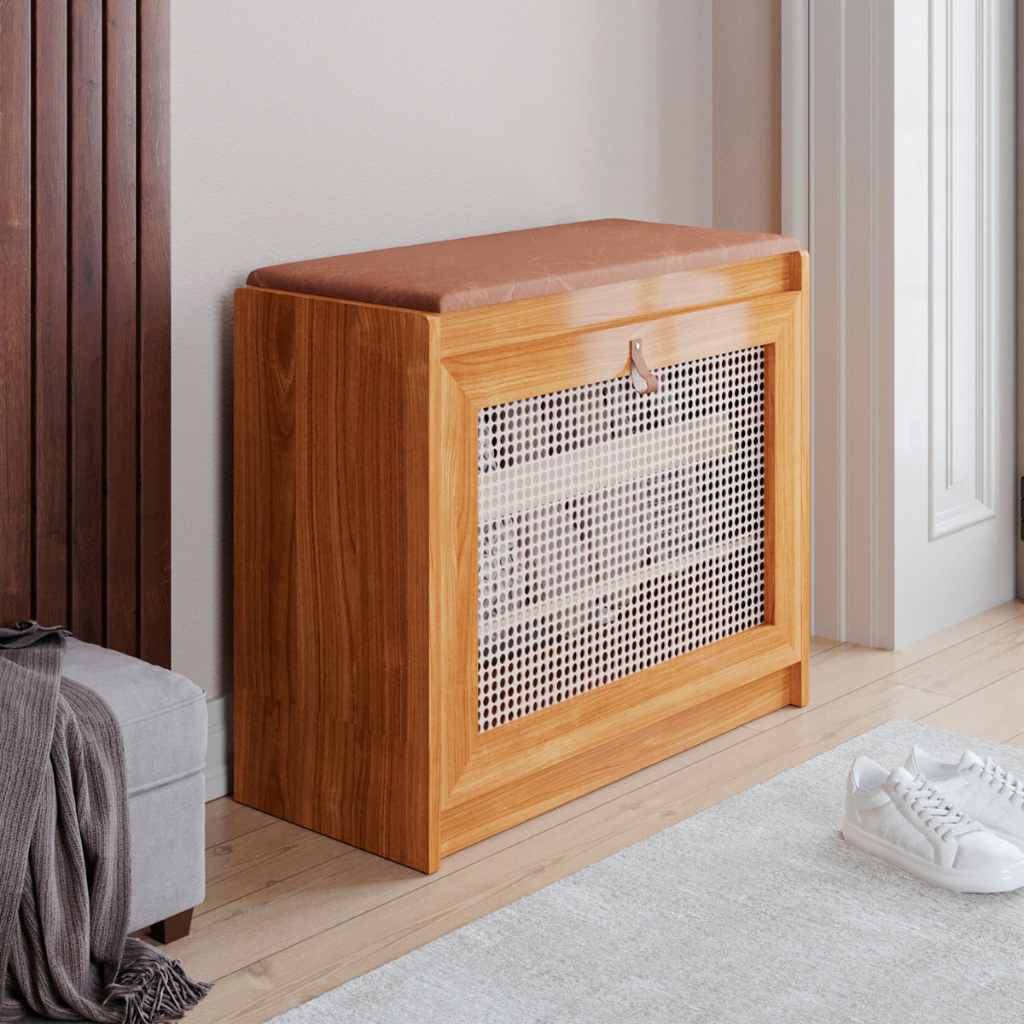 Sapateira Plenitude Em Madeira Banco Estofado Com Porta Basculante Detalhe Ratan Rústico