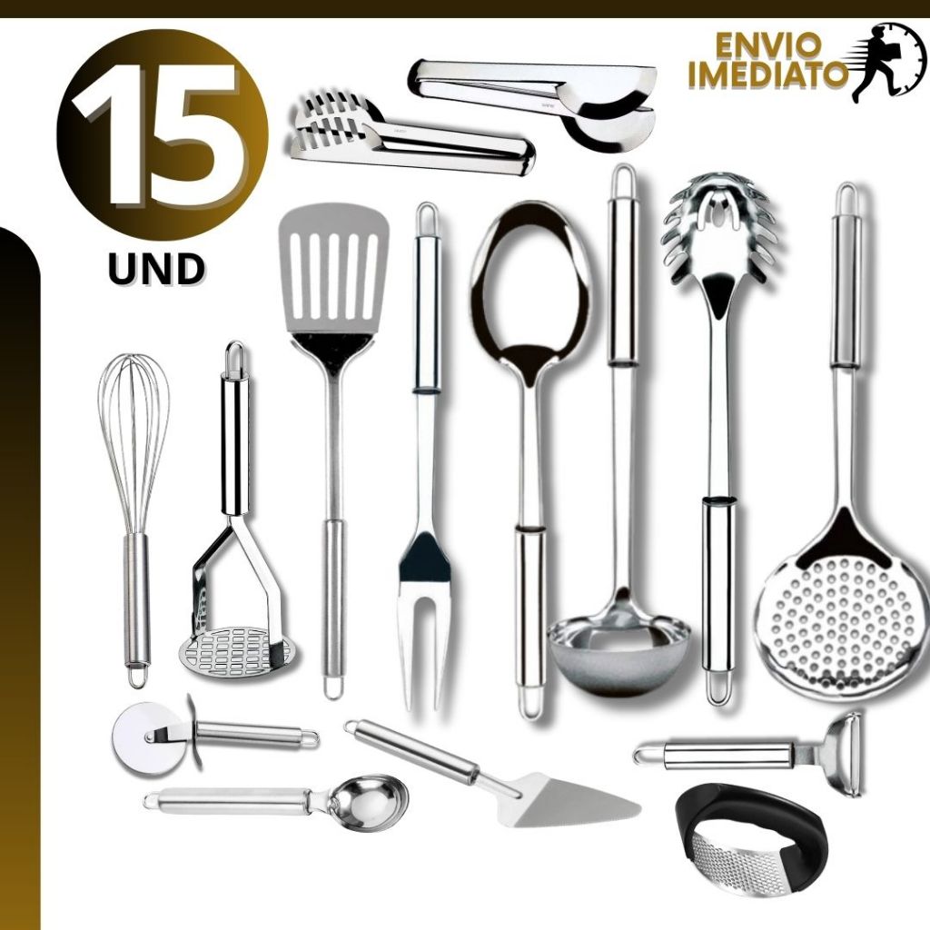 Kit 15 Utensílios de Cozinha em Aço Inox | Colher, Concha, Escumadeira, Pegador, Amassador de Batata