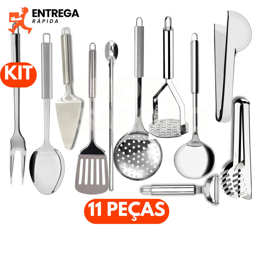 Kit 11 Utensílios de Cozinha em Aço Inox Descascador Amassador de Batata Concha Escumadeira e Mais