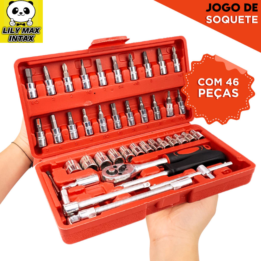 Kit Completo Jogo de Chaves 46 Peças Conjunto de Ferramentas 26cm Aço Maleta Vermelha Pequena c/ Soquetes Bits Catraca Reversível