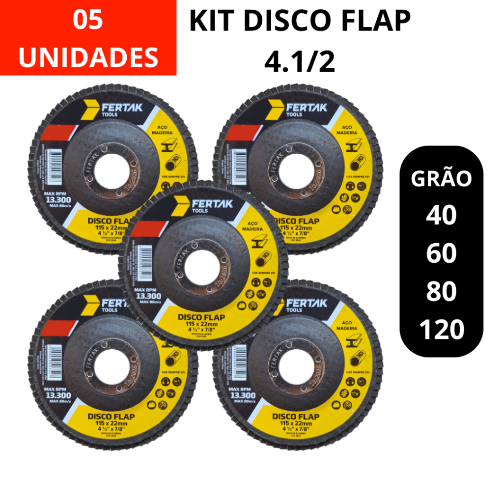 Kit 05 Unidades Disco Flap 4.1/2 Grão 40 60 80 120 Fertak Tools