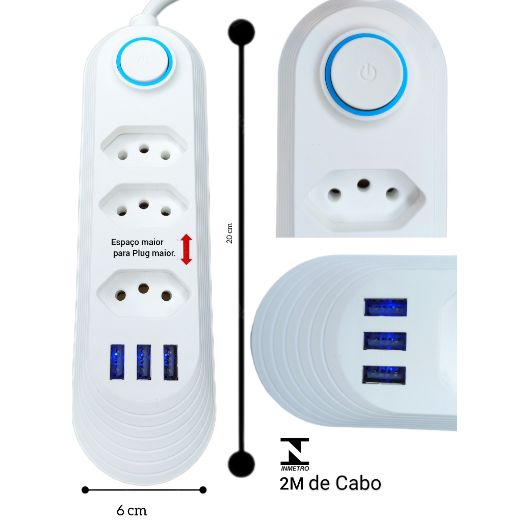 Extensão de Tomada 2 em 1: com 3 entradas de tomada 3 pinos + HUB com 3 entradas USB 3.4A Extensão Elétrica Selo Inmetro