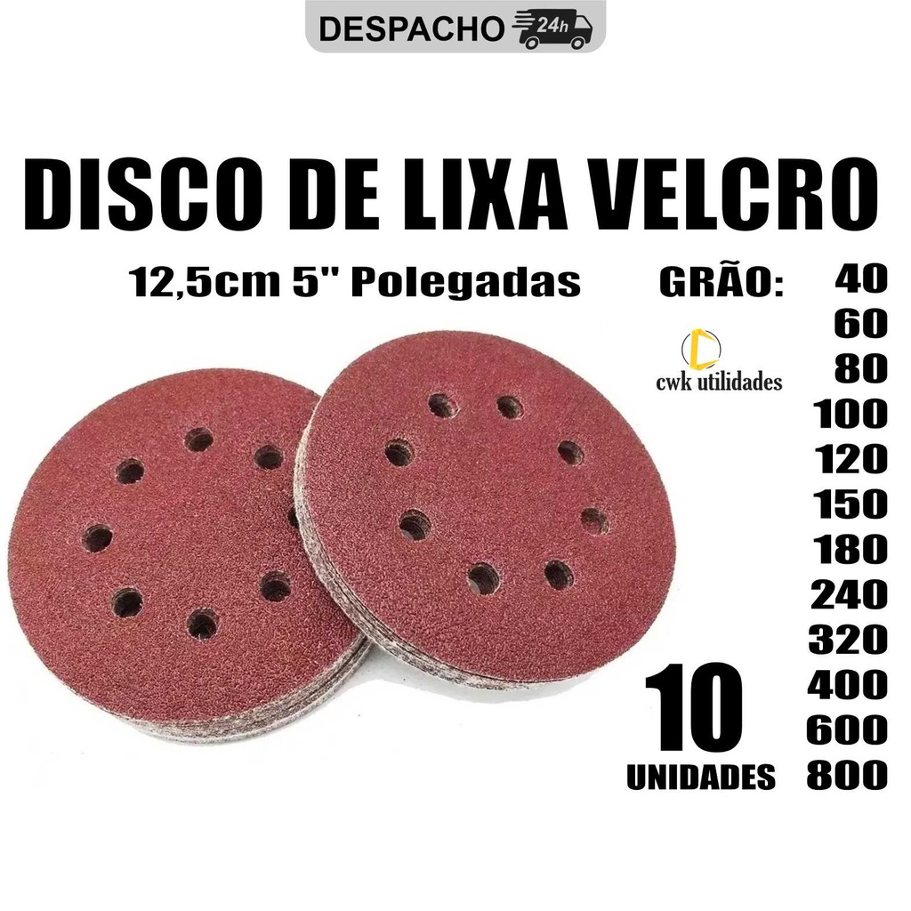 Kit 10 Disco Lixa Velcro 125mm 8 Furos Lixadeira Roto Orbital para Ferro Metal Madeira Massa