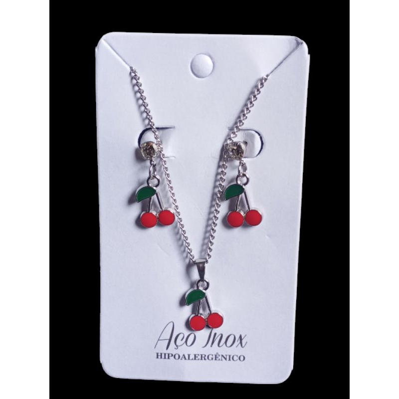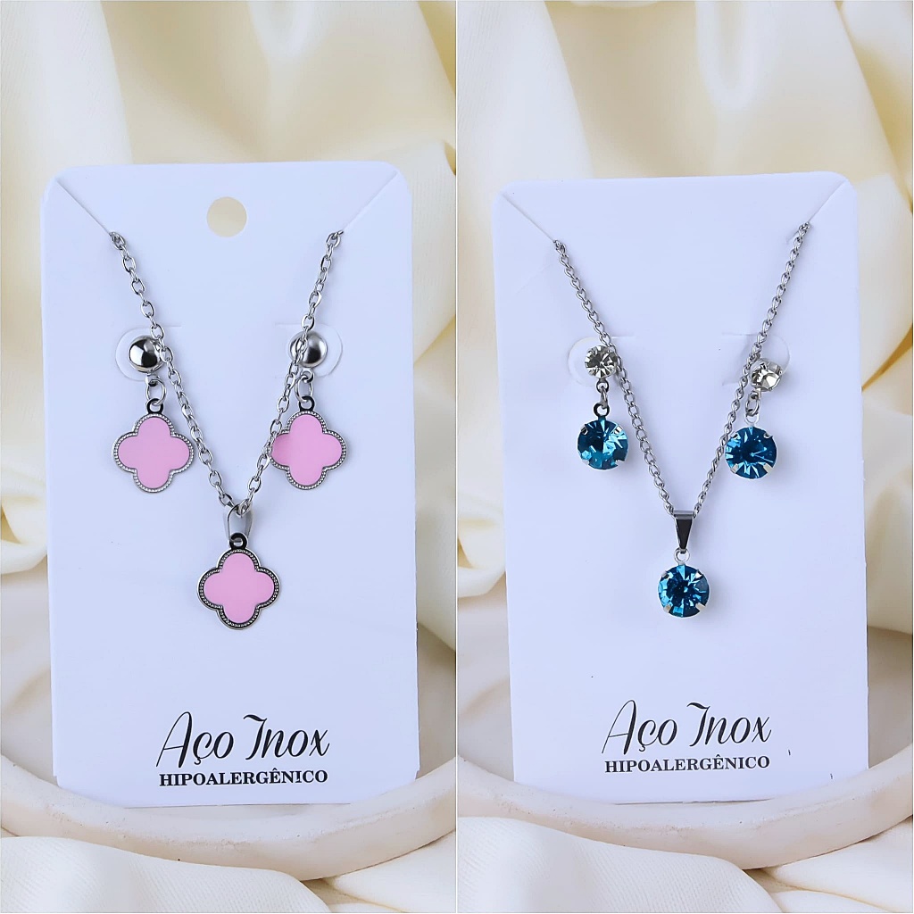 kit 2 cartelas de conjunto brinco e colar aço inox cod 381