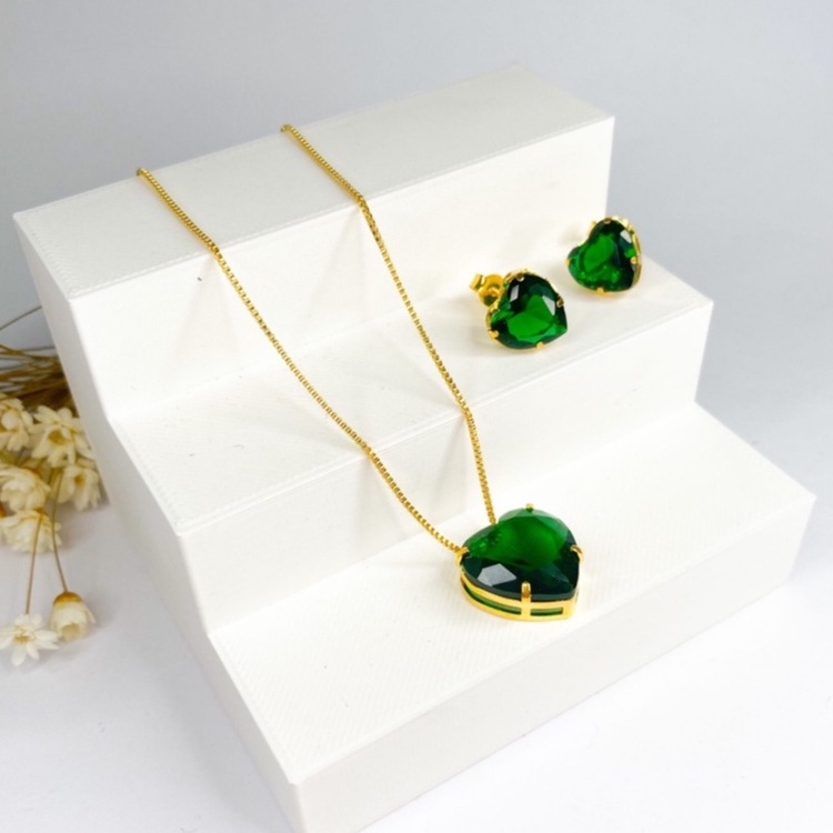 kit conjunto colar e brinco feminino aço inoxidável pingente de coração strass