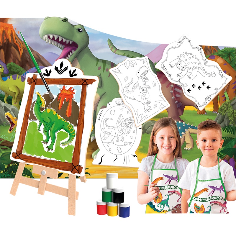 Kit Pintura Infantil Dinossauro: 4 Telas Pintura 21x30 + 1 Mini Cavalete + Caixa com 06 Tintas + 1 Pincel + 1 Paleta + 1 Avental